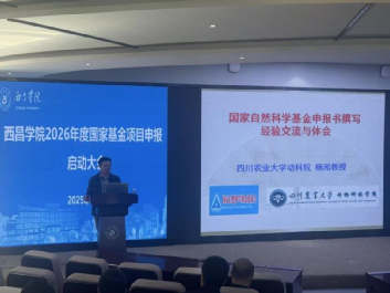 为扎实推进2026年度国家基金项目申报工作,提升学院教师科研项目申报能力与撰写水平,近日,动物科学学院积极响应学校科研工作部署,组织召开国家基金项目暨科研奖励项目申报启动大会。会议特邀四川农业大学动物科技学院副院长杨淞教授来院开展专题培训,学院领导班子、科研骨干及青年教师代表参会学习。