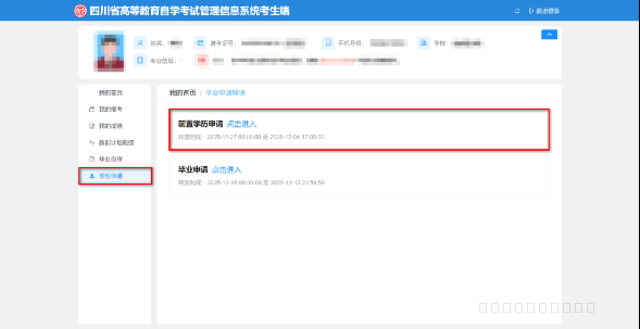 考生在计算机上登录自学考试管理信息系统(https://zk.sceea.cn),进入菜单【毕业申请】中【前置学历申请】。