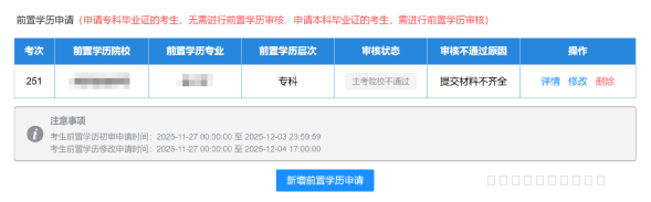 考生在规定的时间内,进行前置学历申请,系统展示已申请的前置学历信息,如果还没有申请,点击【新增前置学历申请】,进入申请页面。