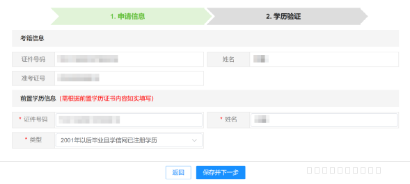 1、确认当前考籍信息(证件号码、姓名、准考证号);2、确认前置学历信息(证件号码、姓名、类型)。