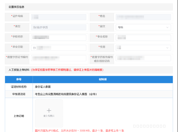 前置学历是2001年以前毕业且学信网已注册学历、全日制军事院校学历、海(境)外学历、以及扫码验证后身份信息不一致的,需要填写信息和上传材料,进行人工审核。