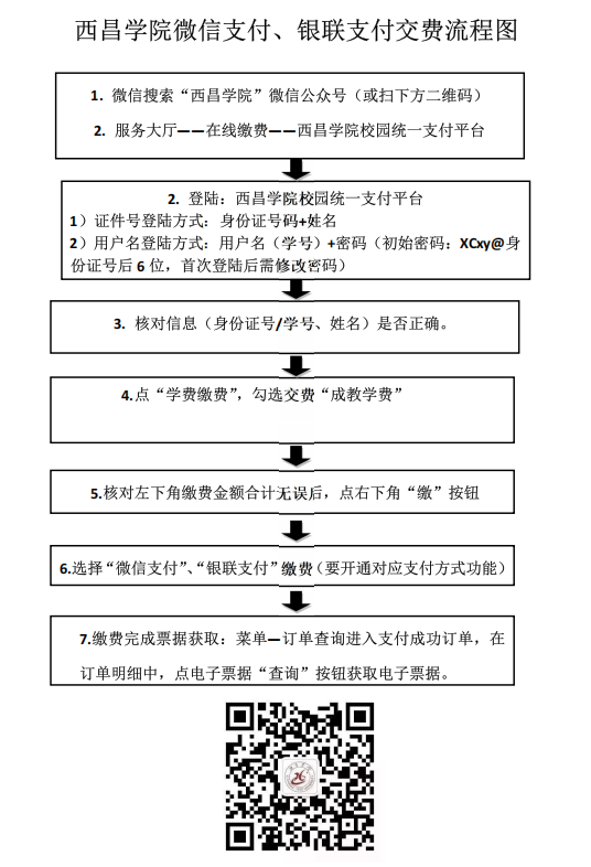 特此温馨提醒各位同学:西昌学院校园统一支付平台是学校成教、自考学费唯一缴费平台,如将学费缴至其他任何单位或个人,造成的一切后果由学生本人承担。