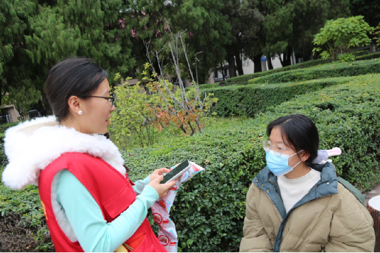 本次活动由学生志愿团队主导,以“流动式有奖问答”的形式推进,让防诈骗知识深入人心。志愿团队随机邀请过往同学,围绕“全国统一的反电信网络诈骗专用号码是?”“保护你资金安全的最后一道防线,绝对不能告诉任何人的‘三件套’是什么?”等问题进行互动问答,答对的同学可以当场获得小奖品,答错的志愿者也会及时讲解正确的防诈知识。