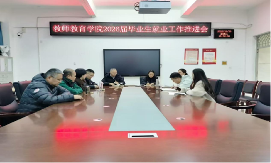 2025年12月23日,教师教育学院召开2026届毕业生就业工作推进会,这是在就业工作关键节点召开的一次重要工作会议。会议深入贯彻习近平总书记关于就业工作的重要指示精神,全面落实教育部和四川省的决策部署,体现了学院党委对毕业生就业工作的高度政治自觉和强烈责任担当。本次会议由学院党委书记陈家才主持,学院班子成员、学生科、办公室、教研室负责人以及毕业生辅导员和学院就业干事参会。