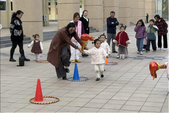 致知楼广场上,火把障碍赛点燃了亲子协作的热情。彩色路障与圆环依次排开,孩子们手持仿真火把在起点整装待发,指令发出后,在父母的陪伴与协助下,灵活绕过锥形路障、小心跨过地面圆环,在奔跑与转向中努力保持平衡。橙红的火光随步伐轻轻晃动,孩子们专注的眼神与坚定的步伐,在一次次跨越与转身后,不仅锻炼了身体协调性与平衡感,更在亲子协作中收获了勇气与成长。