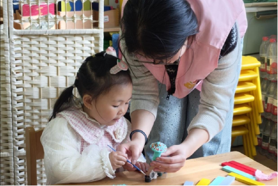 小朋友在认真制作小蘑菇