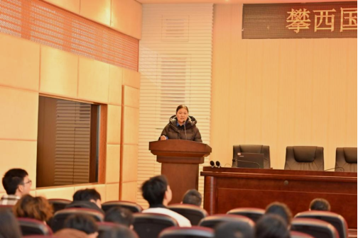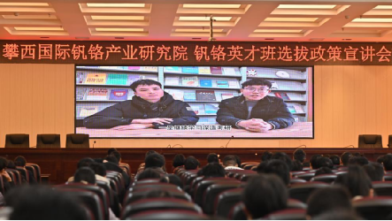 2025年12月18日,攀西国际钒铬产业研究院第一届钒铬应用英才班选拔政策宣讲会在图书馆报告厅举行,学院各专业学生积极参与宣讲会,会议由学院党委副书记陈晓莉主持,攀西国际钒铬产业研究院行政院长曾兵、学院副院长张娜、辅导员等参加会议。