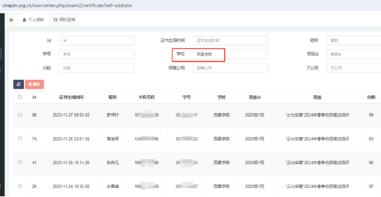 上图:云光车聘平台-西昌学院大学生“车企校招笔试测评”成绩