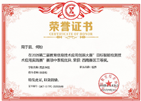 2025年7月,西昌学院机械与电气工程学院学生何盼、周于凯在张劲松老师指导下,参加了由中国教育技术协会主办,浙江大学、中国教育技术协会网络安全专委会联合承办的2025年第二届教育信息技术应用创新大赛中的目标智能检测技术应用实践赛。该赛聚焦目标检测、深度学习等技术的实践应用,是检验学生人工智能技术工程化落地能力的重要平台