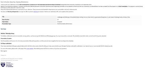大会上,王棚以《城乡共治视角下的生活垃圾分类困境与路径探索——以中国四川会东县为例》为题,作十分钟口头报告,深入剖析城乡二元结构下垃圾分类政策的现实困境,提出城乡共治的治理路径,回应了联合国可持续发展目标中“可持续城市和社区”“负责任消费和生产”的核心议题;邓景则以《多中心治理视角下四川德昌县政府在城乡社区治理中的行为探究》为题,进行三分钟学术演示,从多中心治理理论出发,结合实地调研,剖析基层政府在城乡治理中的职能与挑战,并提出多元主体协同参与的实践策略,呼应了SDGs“和平与伙伴关系”的研究方向。两位同学以流利的英文表达、扎实的田野调研和鲜明的理论视角,赢得了国际同行的高度关注与赞誉,她们的表现不仅展示了西昌学院在本科生科研培养、国际化教育方面的成果,更体现了新时代青年学子走出课堂、学以致用的实践风貌。会后,王棚同学表示,这次经历极大开阔了她的学术视野,更坚定了将所学知识用于服务地方发展的决心;邓景则感言,学术无国界,希望未来能把更多中国基层治理的经验分享给世界。