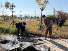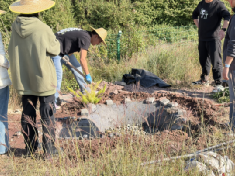 实训之初,各小组迅速进入状态,以实干开启实训征程。同学们分工明确、协同发力,手持农具躬身田间,有序开展草地开荒、杂草清除、场地铲平、定点挖坑等基础工序。从杂乱的草地到平整的施工场地,从生疏的操作到熟练的配合,大家在日晒劳作中褪去书卷气,在亲手耕耘中理解“场地是景观的根基”,为后续水景景观的搭建筑牢坚实基础,也初步体会到景观施工的严谨与不易。