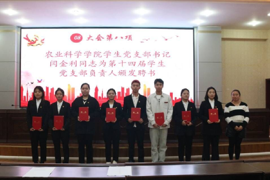 最后,闫金利同志为第十四届学生党支部负责人颁发聘书,并对全院党员、预备党员提出殷切期望,希望各位党员、预备党员同志能够努力让自己在思想和行动上与党组织保持高度一致,践行为人民服务的宗旨。在工作中脚踏实地、积极肯干,在学习中严谨认真、刻苦钻研,用实际行动来诠释自己。激励全体参会人员不怕苦、 不畏难、 不惧牺牲,用臂膀扛起如山的责任,展现出激昂的风采,展现出中华民族的希望!