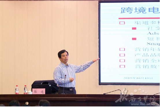 10月19日,对外经济贸易大学陈进教授《跨境电商创新发展与乡村振兴》讲座在我校北校区图书馆报告厅举行,经济管理学院教师及16、17、18、19级电子商务专业学生参加讲座,讲座由胡金朝副院长主持。 胡金朝副院长代表学校对陈进教授的到来表示热烈欢迎,并向在座师生介绍了陈进教授的基本情况。
