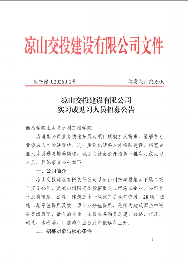 凉山交投建设有限公司实习或见习人员招募公告