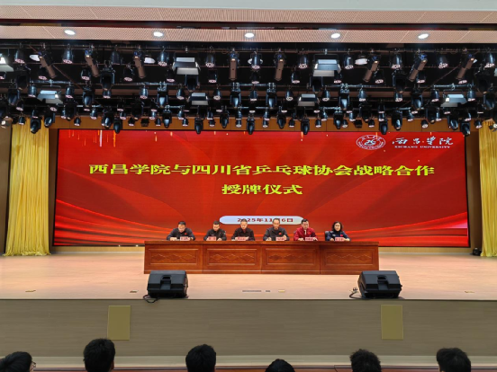 为深入落实立德树人根本任务,落实国家体育发展战略,推动乒乓球运动在高校的普及与优秀人才培养,2025年11月6日上午,西昌学院与四川省乒乓球协会在学生事务活动中心成功举行战略合作授牌仪式。中国乒乓球协会裁判委员会副主任、四川省乒乓球协会党支部书记兼秘书长代天云,四川省乒乓球协会副秘书长、省裁委会主任谢蓥,四川省乒乓球协会裁判委员会副主任杜力平,西昌学院体育学院党委书记马吉勋、院长郎朝春、办公室主任崔文鹏,以及体育学院全体在校教师和部分学生代表参加仪式。仪式由崔文鹏主持。