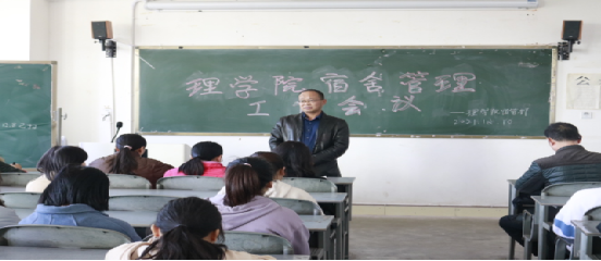为了让理学院全体同学更清晰地了解学校寝室的相关规定,12月10日中午,由我院宿管部承办的室长大会于5教5608教室召开。参加本次大会的有学院党委副书记黄信,辅导员吴萍、方钫、杨长永、李璐,学院各寝室的室长及宿管部全体成员。会议由王玉涵老师主持。