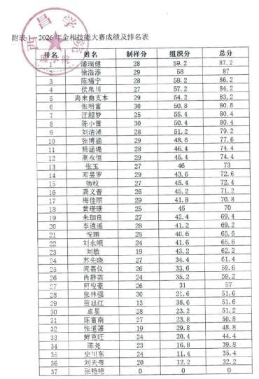 根据附表1的成绩排名,排名前15的同学即为2026年四川省第八届金相技能大赛参赛预选选手,比赛结果公示5天,如对以上成绩存在异议的请联系薛老师(19882037093)。