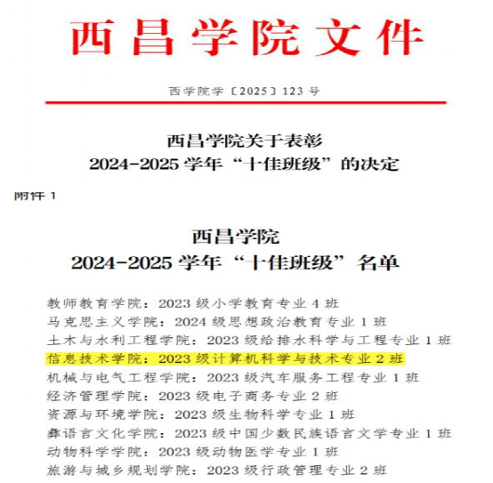 近日,经学院推荐、材料初审评议、网络投票、现场展示、终审评审、全校公示六个环节的严格评审,学校决定授予了全校10个班级为“西昌学院2024-2025学年‘十佳班级’”称号,并予以表彰。其中,我院2023级计算机科学与技术专业2班成功获评,荣获此项殊荣。