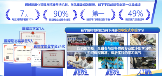 学风建设成效显著,平均学分绩点稳居专业第一,课程及格率90%,英语四级通过率47%。建立学习帮扶小组,营造勤学互助的良好氛围。科研与竞赛齐头并进。班级成员累计获软件著作权16项、专利3项,发表学术论文1篇,参与6项国家级、省级大创项目;累计荣获全国计算机应用能力大赛国家级一等奖1项,计算机设计大赛省级奖项8项,“建行杯”“挑战杯”等赛事省级金奖1项、银奖6项、铜奖12项,竞赛获奖覆盖率达33%。
