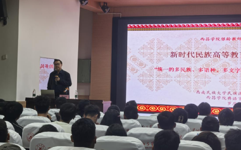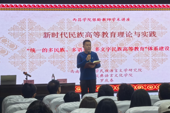 2025年10月16日19:00-21:00,彝语言文化学院在邛海校区学生活动中心举办学科建设系列讲座第24期。本次讲座西南民族大学民族语言文学研究院教授、西昌学院彝语言文化学院银龄教师罗庆春主讲,何文海教授主持,主题为“新时代民族高等教育理论与实践”。