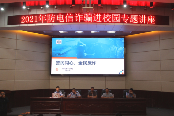 学生时代如一滴微明的露珠,迎着初绽的晨曦,满溢着人生如梦如诗的美好。随着网络时代的高速发展,电信网络诈骗的案例频繁出现在校园内。为有效遏制电信网络诈骗案件的高发多发态势,进一步提升在校学生反诈防骗能力,打造学生的反诈“金钟罩”。2021年9月22日下午七点,由西昌学院彝语言文化学院、西昌市新村派出所、西昌市新村街道办主办的以《警民同心,全民反诈》为主题的防电信诈骗进校园专题讲座在西昌学院南校区学术报告厅开展。