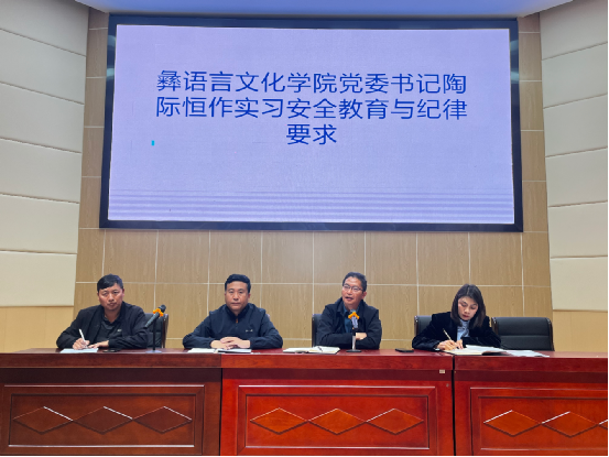 为扎实推进2026年春季集中实习工作,明确任务、强化安全、压实责任,彝语言文化学院于3月16日上午在邛海校区学术报告厅召开春季学期集中实习动员会暨安全教育培训会议。会议由院长何文海同志主持,学院党委书记陶际恒、教务科科长、实习指导教师、23级中少语辅导员、中少语教研室负责人及23级中少语专业全体实习学生参会。