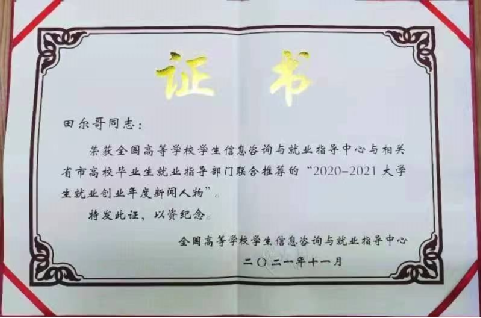 田尔哥(2016届优秀校友)荣获全大学生就业创业年度新闻人物